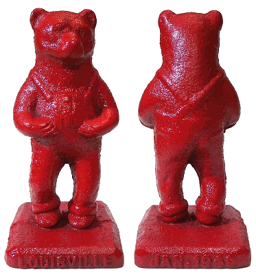 4½" tall "Louisville" embossed on front base, "Jan. 1949" embossed on back base. Note: I have some suspicions about the authenticity of this statue and of the Cub Cadet soldier statue frequently seen on eBay. Cast iron collectibles are often made to "look" old, but may actually be little more 10 years old. They also are not always made by the company represented. I would appreciate your thoughts about this (email me). |